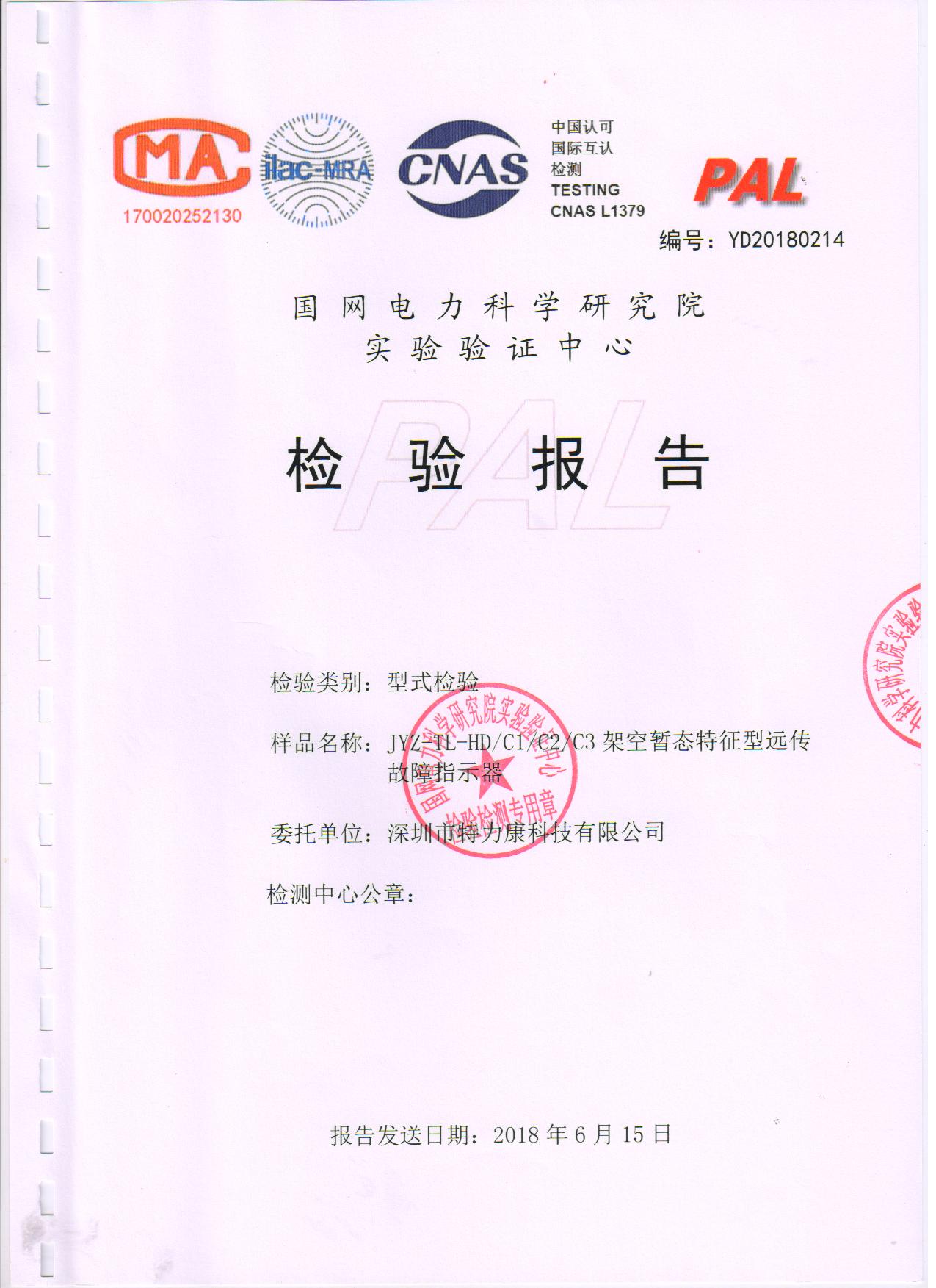我司專注輸電線路在線監測十二年,在智能電網監測領域已有了不凡的地位。然而,為了更好的為電力智能化管理做出貢獻,我司大力組建研發團隊致力于配網故障監測產品開發,經多年研發與掛網測試,于2018年1月20日,經邀請,攜帶我司研發的架空暫態特征型、架空信號遠傳型故障指示器,前往國家電網電力科學研究院進行抽檢試驗及測試。在長達將近5個月的各項性能測試后,我司架空暫態特征型、架空信號遠傳型故障指示器的測試結果均達到合格。因此,于2018年6月15日國網電力科學研究院為我司發放了相關檢測報告證明文件(型式檢測報告)。