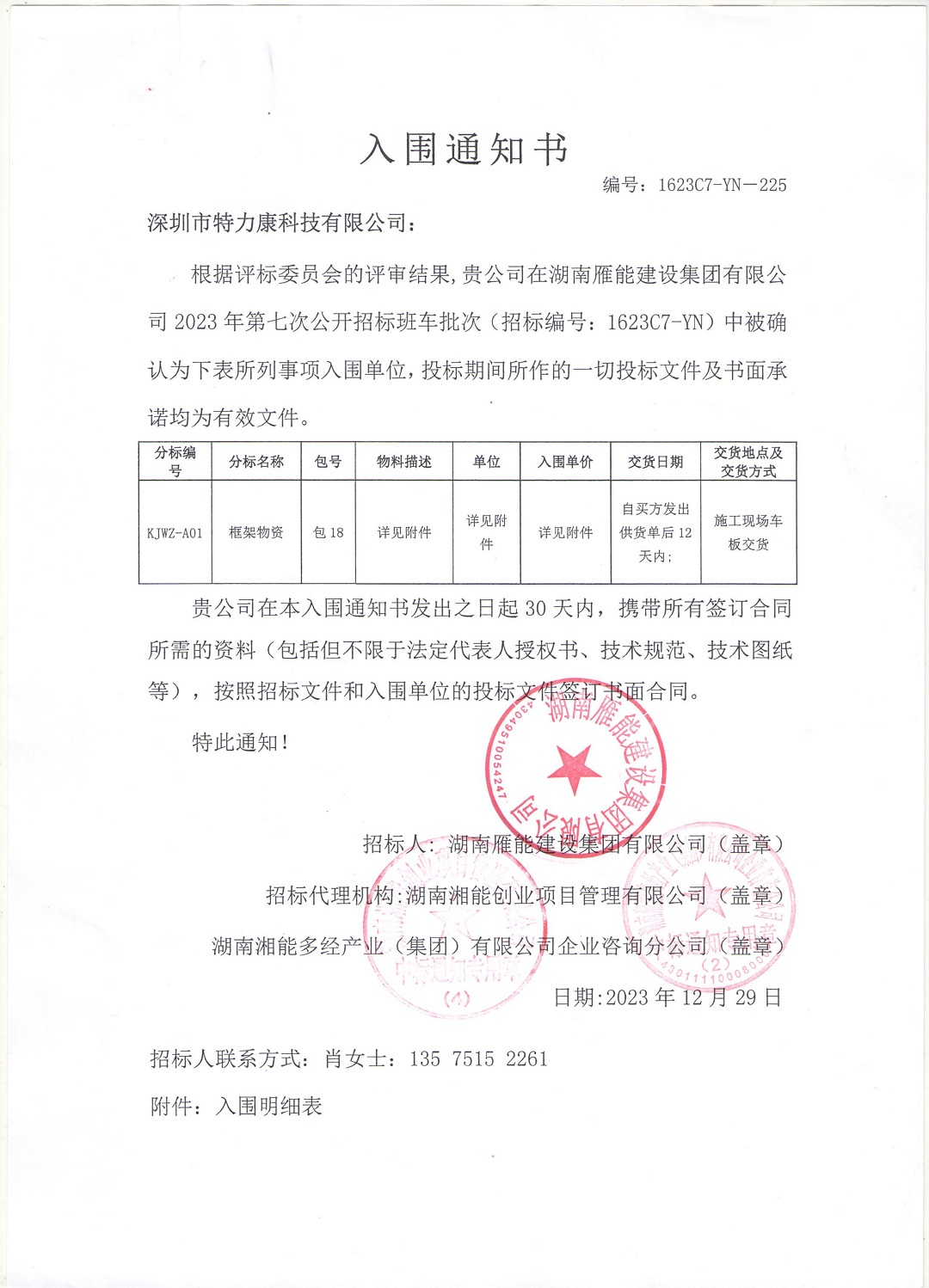 根據評標委員會的評審結果,我司在湖南雁能建設集團有限公司2023年第七次公開招標班車批次(招標編號:1623C7-YN)中表現出色,經過嚴格評審,我司被確認為本次招標項目的入圍單位。