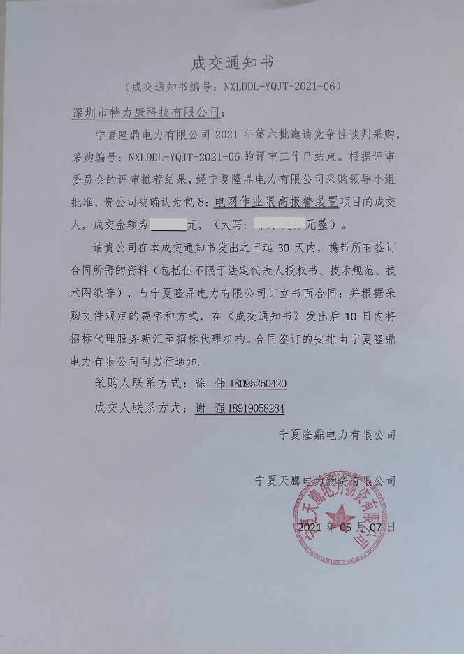 寧夏隆鼎電力有限公司2021年第六批邀請競爭性談判采購,采購編號: NXLDDL-YQJT -2021-06的評審工作已結(jié)束。根據(jù)評審委員會的評審?fù)扑]結(jié)果,經(jīng)寧夏隆鼎電力有限公司采購領(lǐng)導(dǎo)小組批準(zhǔn),我司被確認(rèn)為包8:電網(wǎng)作業(yè)限高報警裝置項目的成交人,中標(biāo)通知如下: