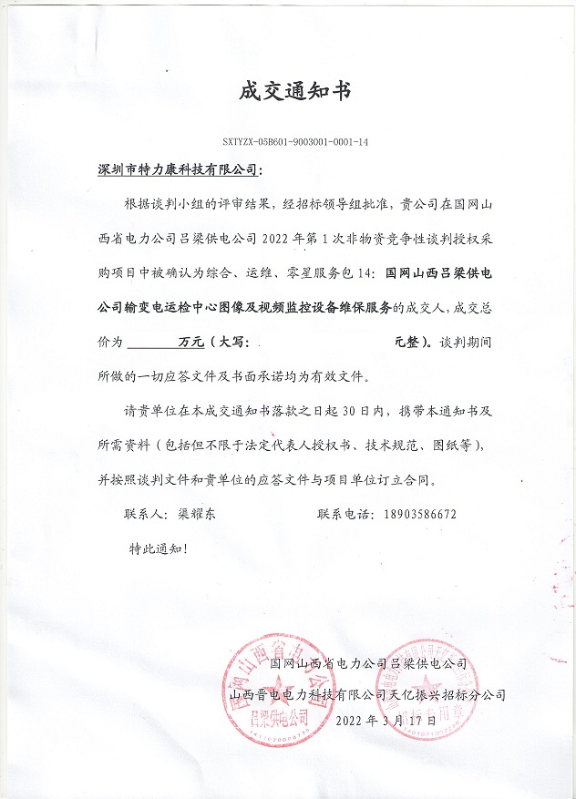 根據(jù)談判小組的評審結(jié)果,經(jīng)招標(biāo)領(lǐng)導(dǎo)組批準(zhǔn),貴公司在國網(wǎng)山西省電力公司呂梁供電公司2022年第1次非物資競爭性談判授權(quán)采購項目中被確認(rèn)為綜合、運(yùn)維,零星服務(wù)包14:國網(wǎng)山西呂梁供電公司榆變電運(yùn)檢中心圖像及視頻監(jiān)控設(shè)備維保服務(wù)的成交人,中標(biāo)公告如下: