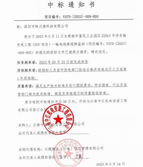 我司于2023年5月11日為楚雄市富民工業園區220kV宇澤變輸變電工程(EPC項目)-輸電線路視頻監控(項目編號: YDTD-[2023]-009-005) 所提交的投標文件已被我方接受,確定成交。